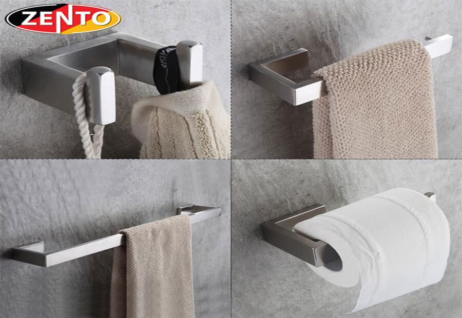 Combo phụ kiện Zento thường bao gồm các sản phẩm cơ bản như giá để khăn, móc treo quần áo, kệ để xà bông, và giá để đồ nhà tắm khác, giúp đáp ứng mọi nhu cầu sử dụng.